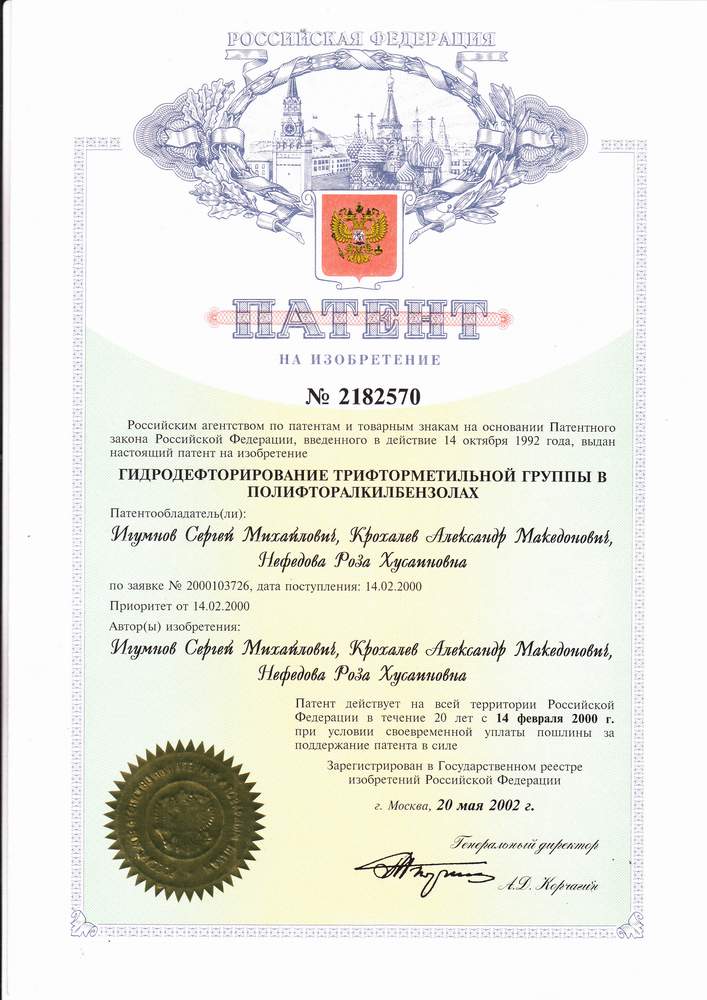RU2182570 (C2) - 2002-05-20 HYDRODEFLUORINATION OF TRIFLUOROMETHYL GROUP IN POLYFLUOROALKYLBENZENES Compounds synthesized in reaction of hydrodefluorination are used as intermediate substances. Hydrodefluorination reaction of CF3-group is carried out with aluminium chloride and cyclic-C5- C6 or aliphatic-C5- C12 hydrocarbon in medium of chloroorganic solvent at heating from 30 to 80 C. Method provides the selective hydrodefluorination of CF3-group in polyfluoroalkylbenzenes using low-priced and available raw. EFFECT: improved method of hydrodefluorination, decreased cost. |