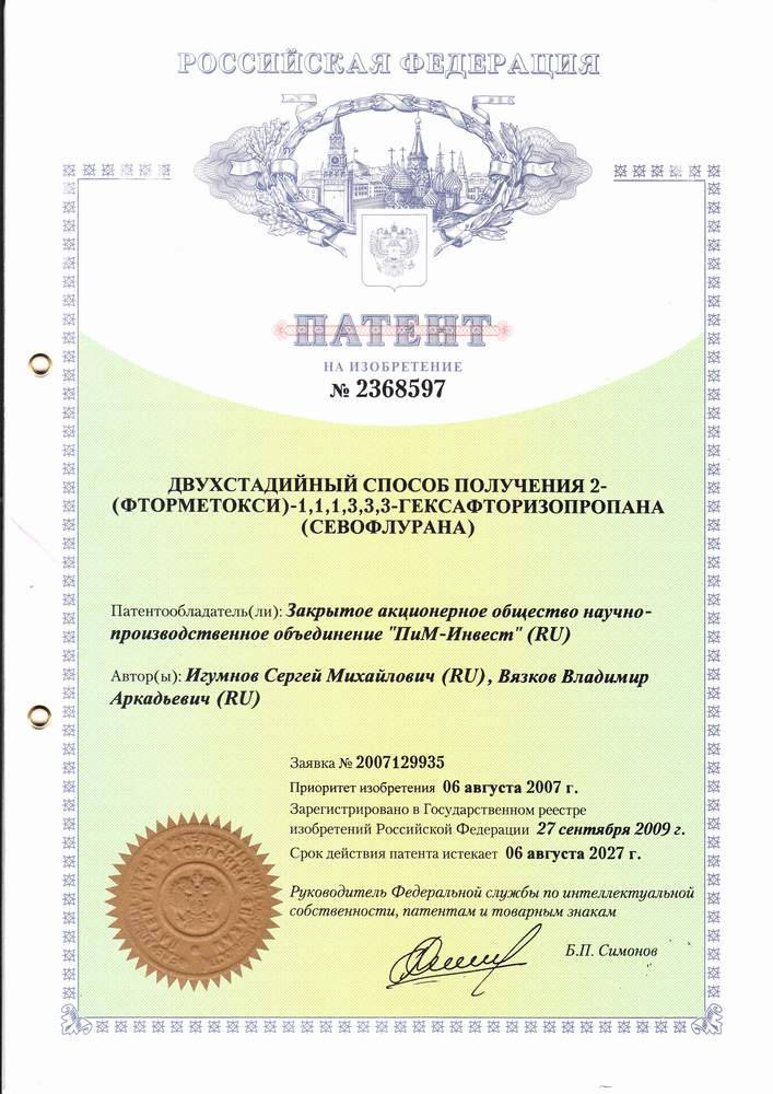 RU2368597 (C2) - 2009-09-27 TWO-STAGE METHOD OF OBTAINING 2-(FLUOROMETHOXY)-1,1,1,3,3,3-HEXAFLUOROISOPROPANE (SEVOFLURANE) Invention relates to a two-stage method of obtaining 2-(fluromethoxy)- 1,1,1,3,3,3-hexafluoroisopropane (sevoflurane) by reacting 1,1,1,3,3,3-hexafluoroisopropanol-2 with 1,3,5-trioxane or paraformaldehyde and chlorosulphonic acid, with subsequent extraction of 2-(chloromethoxy)- 1,1,1,3,3,3-hexafluoroisopropane (sevoflurane) and its treatment with a fluoride of an alkali metal (aqueous potassium fluoride solution) or ammonium in the presence of triethylamine. The process is carried out at molar ratio of reagents trioxane : 1,1,1,3,3,3-hexafluoroisopropanol-2 : chlorosulphonic acid 1 : 1.8-2.5 : 3-3.5, while stirring at temperature +5-20C, with subsequent separation and distillation of an organic layer.; Treatment with potassium fluoride is done at 72-75C, with molar ratio of components : sevochlorane : potassium fluoride : triethylamine 1 : 1 : 0.15. ^ EFFECT: simplification of the process due to prevention of formation of an intermediate aluminium hydrochloride polymer, stable output of products. |