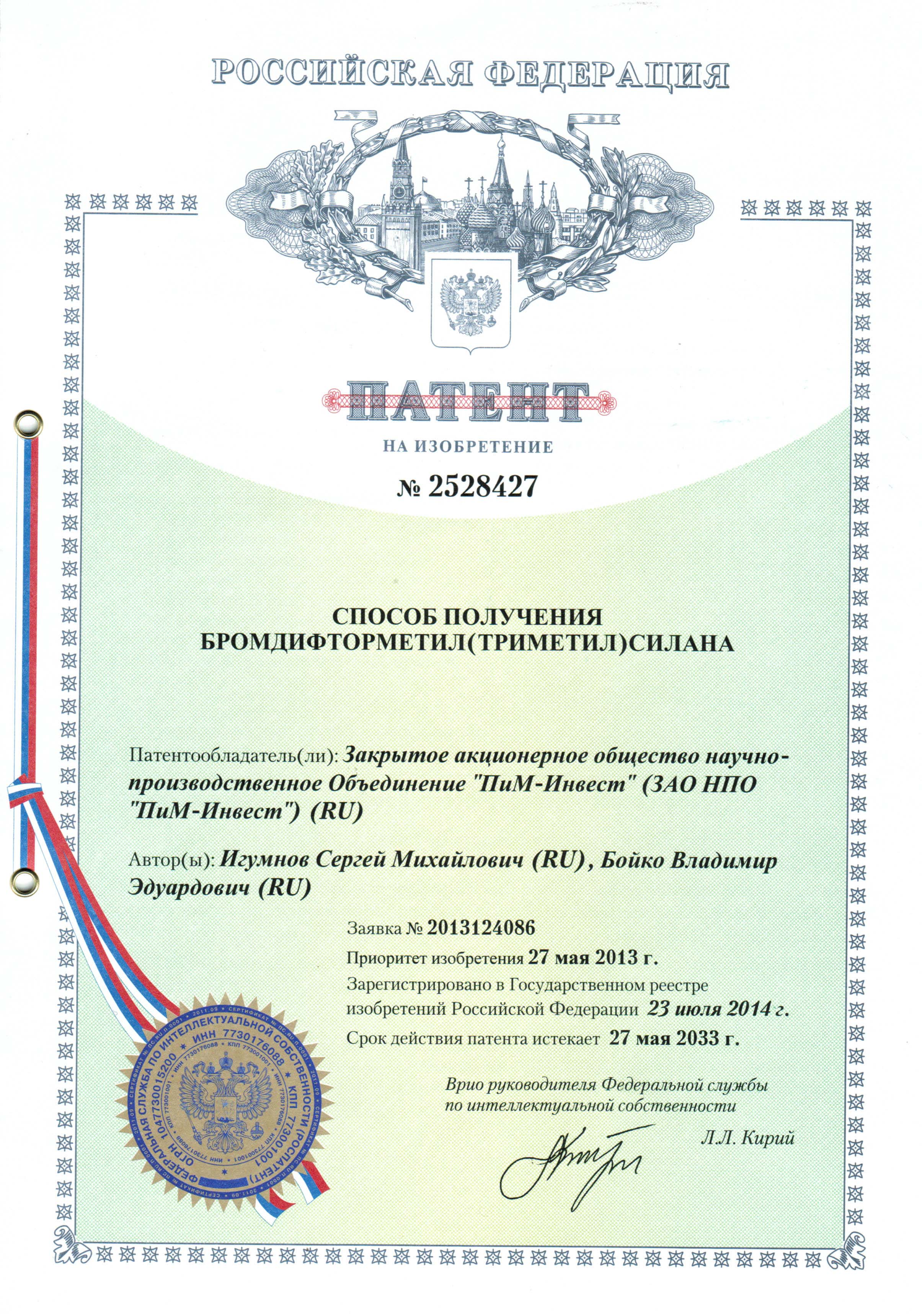 RU2550139 (C1) 2015-05-10 METHOD FOR PRODUCING TRIMETHYL(TRIFLUOROMETHYL)SILANE What is presented is producing trimethyl(trifluoromethyl)silane by a reaction of trimethyl(trichloromethyl)silane with a fluorinating agent specified in: bromine activated antimony trifluoride, or antimony pentachloride activated antimony trifluoride, or gaseous hydrogen fluoride in the presence of antimony pentachloride; the reaction is carried out at heating in an inert fluorinated solvent, such as n-chlorbenzotrifluoride, or solvent-free.EFFECT: possibility to produce the high-yield compound with using no ozone-damaging freon gases and complex instrumentation. |