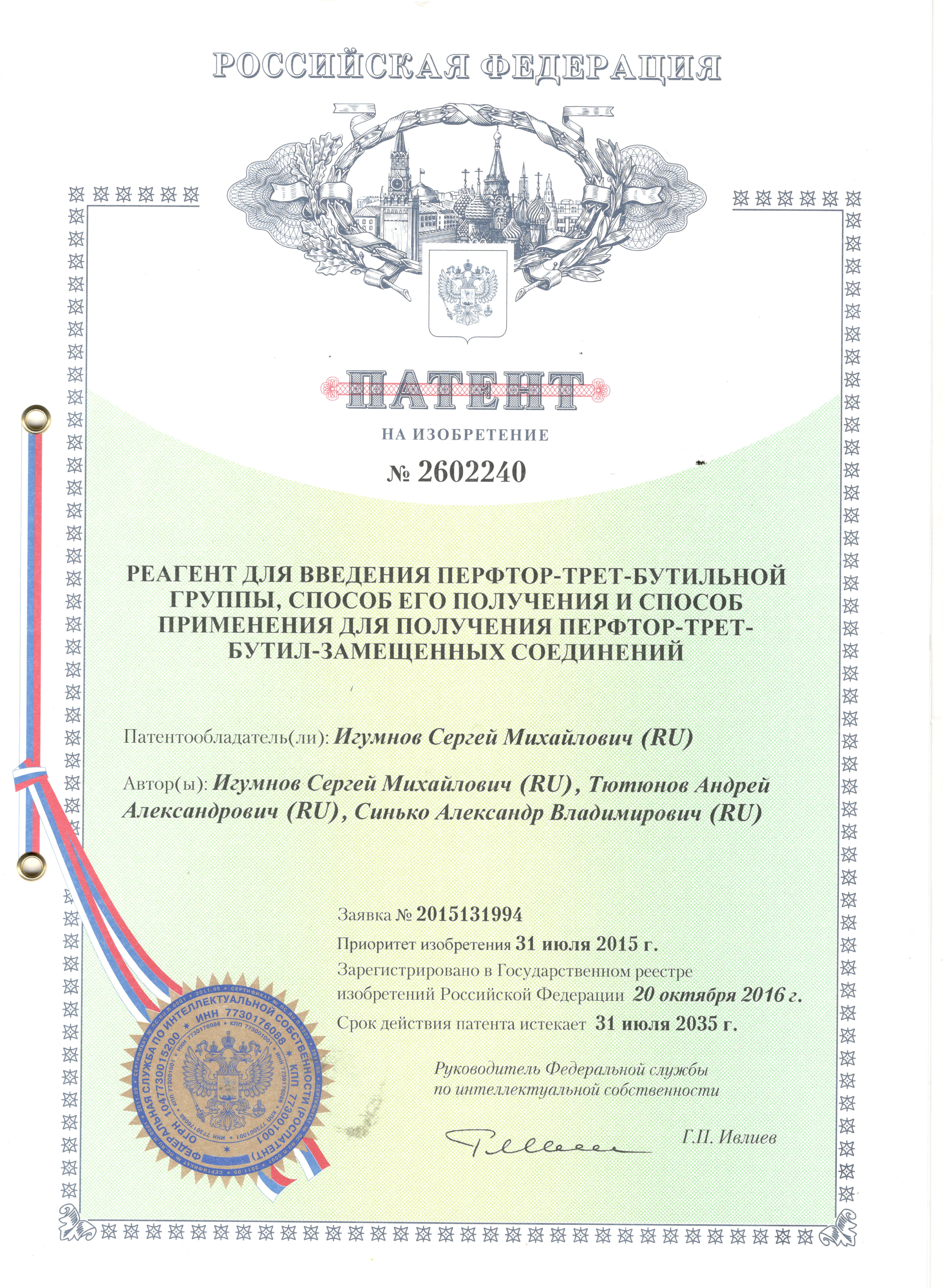 RU2602240 (C1) 2016-11-10 REAGENT FOR INTRODUCTION OF PERFLUORO-TERT-BUTYL GROUP, METHOD FOR PRODUCTION THEREOF AND METHOD FOR PRODUCING PERFLUORO-TERT-BUTYL-SUBSTITUTED COMPOUNDS Invention relates to use of 1,1-dichlorohexafluoroisobutylene as a reagent for introduction of perfluoro-tert-butyl group in a method of producing compounds, containing perfluoro-tert-butyl group, involving preparation of perfluoro-tert- butyl anion in a solution, and reacting obtained perfluoro-tert-butyl anion with different electrophilic reagents, is characterised by that perfluoro-tert-butyl anion is obtained by reacting 1,1-dichlorohexafluoroisobutylene with fluorine caesium in polar aprotic solvent, such as dimethyl formamide or acetonitrile. Invention also relates to a two-step method of producing 1,1-dichlorohexafluoroisobutylene from 1,1,1-trichloro-3,3,3-trifluoro-2-(trifluoromethyl)propanol, first step of which consists in producing an ester of 1,1,1-tr ichloro-3,3,3-trifluoro-2-(trifluoromethyl)propanol and acid, such as acetic, trifluoroacetic or methanesulphonic, by reacting with anhydride or with acyl chloride of corresponding acid in presence of a base, and second reaction of obtained ester with metal, such as zinc, in a polar boiling solvent, such as sulfolane, with subsequent extraction of produced 1,1-dichlorohexafluoroisobutylene by distillation of reaction mixture. EFFECT: using less toxic alternative reagent. . |