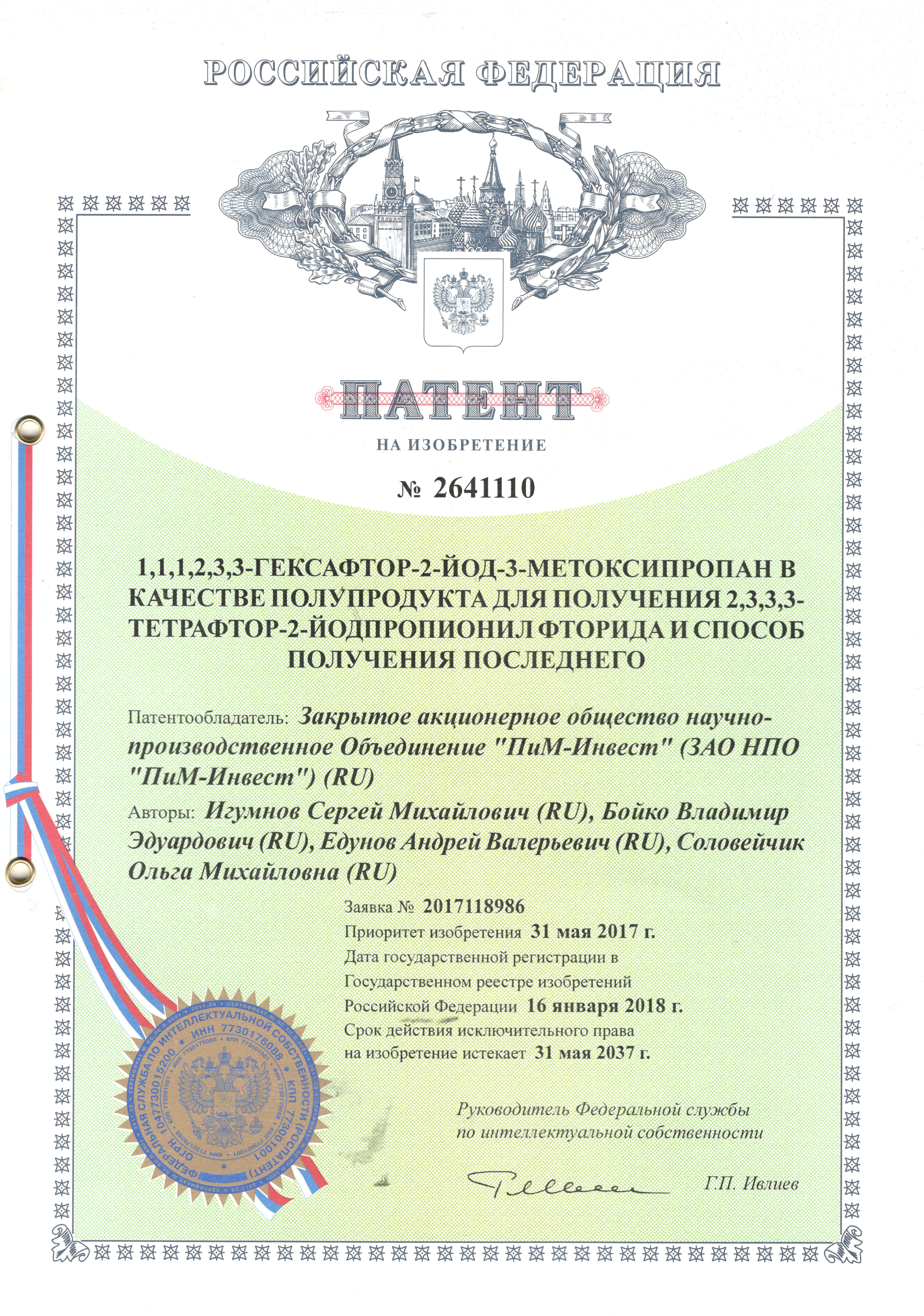 1,1,1,2,3,3-HEXAFLUORO-2-IODINE-3-METHOXYPROPANE AS SEMI-PRODUCTS FOR PRODUCTION OF FLUORIDE 2,3,3,3-TETRAFLUORO-2-IODPROPIONYL AND METHOD OF PRODUCING LATTER Invention relates to a new connection - 1,1,1,2,3,3-hexafluoro-2-iodine-3-methoxypropane, which is used as a semiproduct in the method of obtaining 2-iodine-perfluoro-propionyl-fluoride from perfluoro-propylene, which includes two stages: the interaction of perfluoro-propylene with a source of iodine, such as 2-iodine-perfluoro-propan (perfluoro-isopropylidene), elemental iodine, chloride iodine or bromide iodine and sodium metilate, using a polar aprotic solvent with producing 1,1,1,2,3,3-hexafluoro-2-iodine-3-methoxypropane, the interaction of the resulting 1,1,1,2,3,3-hexafluoro-2-iodine-3- methoxypropane with pentachloride antimony by boiling with producing 2,3,3,3-tetrafluoro-2-iodine propionyl-fluoride emitting its distillation. EFFECT: use of available starting mater ials without the use of aggressive reagents and appropriate equipment, increasing the purity of the semiproduct, and the yield of the product of 2-iodine propionyl-fluoride. . |